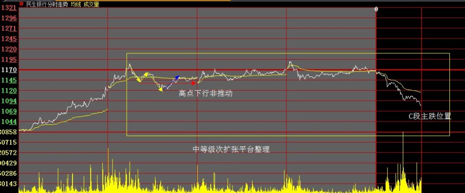 高点下行非推动很明显,这里应该是一级某四的下行段,由此可推论后面还会有一个末段上行推动。但是,在跌势中,以仍然会有上行安慰自己显然不智,当平台形成时,在其B段应该要考虑做反向差价。尤其是其后是一轮C,某四若是锯齿型调整则杀伤力不可小觑。故减仓差价在破B段下趋势线时应该执行部分仓位减仓,而不是到了C已然大幅下行之后才跟风下杀。